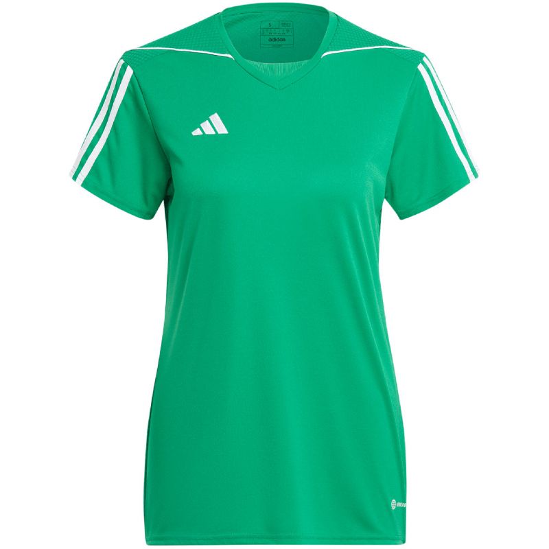 „adidas Tiro 23 League“ marškinėliai, žali IC7481. Šie moteriški „Adidas“ marškinėliai puikiai tinka žaidimui. Standartinio kirpimo. V formos iškirptė. Tinklinė nugaros dalis. „Aeroready“ technologija sugeria drėgmę. Perdirbti pluoštai. Medžiaga: 100 % perdirbtas poliesteris.