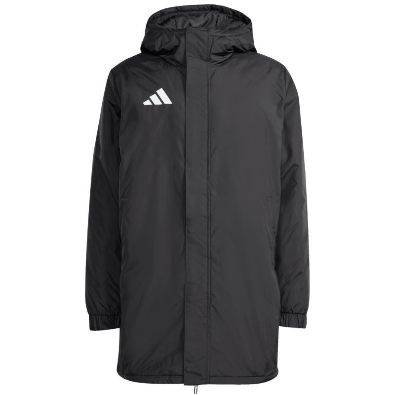 „adidas Entrada 26“ stadiono striukė, juoda JZ6668. Ši vyriška „Adidas“ striukė skirta ilsėtis aikštės pakraštyje. Ji pasižymi įprasto kirpimo, per visą ilgį užtraukiamu dizainu. Pritvirtintas gobtuvas. Užtrauktuku užsegamos šoninės kišenės. Rankogaliai su rankogaliais. Spaudėtu atvartu apsauga nuo lietaus. Sintetinė pašiltinimas. Išorinis audinys: 100 % perdirbto poliesterio. Užpildas: 100 % perdirbto poliesterio.