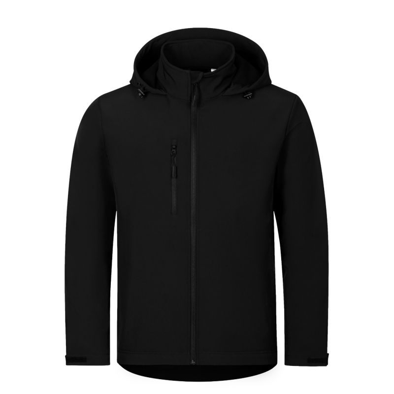 Minkštas audinys: 96 % poliesteris, 4 % elastanas, 100D, 4 kryptimis tempiamas, vandeniui atsparus paviršius, vidinė pusė: 100 % poliesteris – mikroflisas, nesipūkuojantis paviršius be etiketės – paruoštas prekės ženklo keitimui, dvisluoksnis softshell, tiesaus kirpimo su šoninėmis detalėmis, užtrauktukas priekyje per visą ilgį su apsauga nuo smakro, elastingas gobtuvas su raišteliu ir raišteliu apačioje, etiketė gale neutralaus dydžio, reguliuojami rankovių apvadai su „Velcro“ juosta, kišenės su spiraliniu užtrauktuku, krūtinės kišenė, šiek tiek prailginta gale, vidinė fliso medžiaga su nesipūkuojančiu paviršiumi.